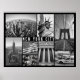 Travel poster of New York City done in black and white - includes images of the cityscape, Empire State Building, Statue of Liberty, Yellow Cabs, and Wall Street.