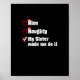 Playful modern Santa design claiming your sister inspired the mischief with a fun holiday twist.