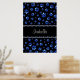 Nom personnalisé, pattes de chien en paillettes bleues sur fond noir.