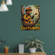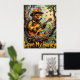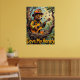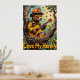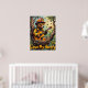 Cette oeuvre d'art chaleureuse capture un ours habillé en équipement de pompier, y compris un casque et des lunettes de soleil, jouant d'une guitare acoustique confortablement assis dans un nid d'oiseau. Les abeilles volent à proximité, et un pot de miel avec un petit citrouille repose dans le nid. L'arrière - plan dispose d'une forêt animée sous un ciel chaud. Les traits épais et texturés de la peinture ajoutent à la qualité attachante de l'image, avec les mots "Love My Honey" en vedette ci-dessous.