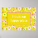 Un motif de gorge lumineux et ensoleillé présente des fleurs blanches avec des centres rose et vert sur arrière - plan jaune. Zone de texte jaune centre avec texte personnalisable "This is our happy place"