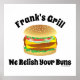 Cette affiche amusante présente l'illustration d'un hamburger juteux et se lit comme "Grill de votre nom" "We Relish Your Buns". Il est personnalisable pour que vous puissiez le personnaliser en ajoutant votre nom. (Vous pouvez également apporter d'autres modifications, si vous le souhaitez). Un cadeau parfait pour le grill, le bar ou la grotte pour homme.