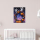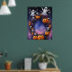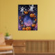 Cette affiche enchanteresse présente une illustration sur le thème de l'Halloween avec en toile de fond un ciel étoilé sombre. Le design comprend un agencement symétrique de feuilles oranges et de branches violettes formant un cadre ovale. Dans ce cadre, quatre figures fantômes expressives flottent à côté de petits papillons blancs. En bas, cinq lanternes jack-o’ aux diverses expressions sculptées apportent une touche festive. Parfait pour ajouter une atmosphère éffrayante mais charmante à tout espace.