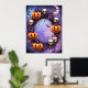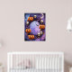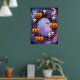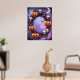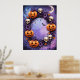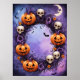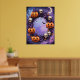 Cette affiche captivante est décorée sur le thème de l'Halloween et présente un agencement central de branches pourpres, semblable à une couronne. Dans ce cadre, vous trouverez des lanternes jack-o’s, des crânes et des bougies fantomatiques dressées contre un ciel nocturne bleu et violet profond avec une lune en croissant et des chauves-souris volantes. Parfait pour ajouter une touche éffrayante mais ludique à votre décor d'Halloween.