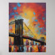 Cette affiche colorée présente une image abstraite d'un coucher de soleil sur New York City avec le pont et l'eau au premier plan. Cette impression présente des tons jaunes, orange et rouges, ainsi que des tons bleus et violets. Cette affiche sans cadre est disponible dans une variété de tailles qui s'adaptent aux cadres standard.