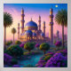 Affiche d'un château du moyen-orient avec des minarets dans une oasis luxuriante dans le désert, dans le style des mille et une nuits arabes. L'image a été réalisée avec Leonardo.ai.