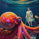 "Ocean’s Silent Captive" - Portrait de pieuvre coloré. Dans un monde océanique surréaliste, une pieuvre géante regarde un homme seul piégé dans un bocal de verre. Cette scène évocatrice explore les thèmes de l'enfermement, de l'immensité de la nature et de la fragile barrière entre liberté et captivité. Les couleurs vives et les détails complexes invitation une profonde réflexion sur la vulnérabilité humaine sous les vagues.