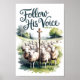 Une illustration aquarelle d'un bâton de berger avec une croix sur le dessus, entouré d'un troupeau de moutons. Le bâton et les moutons sont placés sur un champ vert. Au-dessus de la scène, le texte "Suivez Sa Voix" est écrit dans une police cursive décorative. L'arrière-plan contient quelques arbres.
