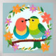 Deux oiseaux aux couleurs vives s'assoient sur une branche entourée de fleurs en fleurs, symbolisant l'amour, la nature et le bonheur printanier. L'oeuvre ludique présente des couleurs vives et des émotions joyeuses.