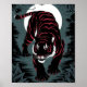 majestueux tigre noir orné de rayures rouges frappantes. Le regard intense de la créature et son positionnement évoquent un sentiment de puissance et de mystère.