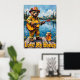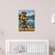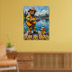 Cette oeuvre d'art chaleureuse capture un ours habillé en équipement de pompier, y compris un casque et des lunettes de soleil, jouant d'une guitare acoustique sur un quai en bois. Un bocal de miel avec une trempette se repose à proximité. L'arrière - plan dispose d'un lac calme, de montagnes vallonnées et d'un ciel bleu en partie nuageux. Les traits épais et texturés de la peinture ajoutent à la qualité de l'image, qui est fantasque et attachante, avec les mots "Love My Honey" en vedette ci-dessous.