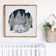 Un ours mignon marchant dans la forêt boisée de la montagne sous la lune avec le nom de votre bébé garçon pour sa chambre de nurserie. Œuvre originale de Caroline Bonne Müller
