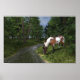 Un cheval de pinto brun et blanc broute paisiblement au bord d'un ruisseau dans la forêt dans cette oeuvre numérique originale, créée en DAZ 3D par Jayne Wilson.