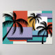 Cette oeuvre vibrante mêle silhouettes de palmiers tropicaux à un arrière-plan géométrique de rectangles aux couleurs chaudes inspirées du coucher de soleil. Le contraste audacieux entre les palmiers noirs et les blocs colorés et modernes crée un spectacle saisissant qui évoque une ambiance de plage rétro. Le design allie éléments tropicaux et géométrie abstraite, ce qui en fait l'endroit idéal pour les décors contemporains ou les projets graphiques sur le thème de la plage.