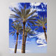 A vivid and interesting perspective view painting of palm trees against a summer sky.