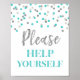 Pancarte servez-vous pour baby shower, enterrement de vie de jeune fille, fête d'anniversaire ou mariage dans un motif de confettis bleu clair et argent. Veuillez noter que l'effet pailleté est un effet photographique uniquement.