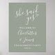 Cette pancarte de fête de fiançailles « elle a dit oui » de couleur vert sauge élégante peut être personnalisée avec les informations de votre fête spéciale. Conçue par Thisisnotme©