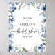 repas de douche de mariéepastels bleu poussiéreux violet marinepanneaux de bienvenueaffiches de bienvenuefleurs sauvages bohèmefleurs à laquarelleélégante douche de mariéeminimaliste simpleécriture typographiquefleurs de verdure