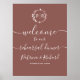 Un panneau de bienvenue pour un dîner de répétition en carton mousse terracotta avec un feuillage chic simple et un monogramme en faux feuilletage. Facile à personnaliser avec vos détails. Panneau de bienvenue pour un dîner de répétition moderne boho en carton mousse modifiable, faire-part de mariage avec photo et couronnes, personnalisable, police calligraphiée manuscrite, simple, élégant.