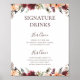 Ce panneau de boissons signature floral orange bordeaux est parfait pour votre mariage champêtre bohème avec des tons rose saumon, vert foncé et or. Le design présente une couronne ou un bouquet de fleurs minimalistes aquarelles aux tons pêche, rose poussiéreux, violet et rose clair, ainsi que du feuillage en cuivre, vert foncé, jaune et rouille. Les fleurs de ce design sont le pavot, la rose et la pivoine. Le design est idéal pour un mariage champêtre simple et élégant au printemps, en été ou en automne. Veuillez trouver d'autres papeteries de mariage assorties et coordonnées dans le reste de cette collection.