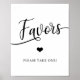 Conception simplement élégante avec des lettres de topographie en script noir et un fond blanc et des lettres noires. Petit cœur au milieu. Pancarte de FAVORS de mariage ou de douche de mariée pour n'importe quelle période de l'année ou thème. Placez le panneau sur la table où les invités peuvent prendre un cadeau à l'entrée ou à leur départ