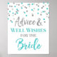 Conseils et vœux pour la pancarte de la mariée pour la douche de noces dans un motif de confettis bleu clair et argent. Veuillez noter que l'effet pailleté est un effet photographique uniquement.