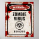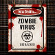 Affiche à l'aspect vintage avec un panneau d'avertissement de virus zombie rouillé, symbole de risque biologique et taches de sang.