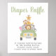 Un joli panneau de dépose de tombola en baby shower avec une aquarelle illustrant des animaux de zoo (lion, éléphant, zèbre, singe et girafe) empilés dans un véhicule safari et un script vert amusant de l'armée.