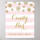 Affiche de la barre de bonbons pour baby shower, douche nuptiale, ou mariage en rayures rose clair et blanc motif avec flocons d'or.