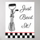 Cette affiche est noire, blanche et rouge avec le texte "Just Beat It" et un graphique d'un vieux batteur rétro avec une bordure à carreaux.