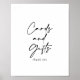 Ce panneau cartes et cadeaux moderne élégant est parfait pour un mariage rustique ou une douche de mariée. Le design simple et élégant présente une typographie classique et fantaisie en noir et blanc. Faites de la ligne de texte en bas du panneau votre propre en incluant la date, les noms de la mariée et du marié ou un court message comme "Merci". Ce panneau peut compléter un mariage, tout événement ou fête.