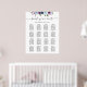 Elégant tableau de mariage ou d'événement spécial avec une bordure florale violet et bleu délicat et de beaux éléments de calligraphie manuscrits modernes. Facile à remplir dans le modèle avec de l'espace pour 16 tables assises ou moins. Pour les événements avec moins de tables, effacez simplement les caractères des zones de texte des tables de bas dont vous n'avez pas besoin. De nombreuses options de taille sont disponibles. Possibilité de changer la couleur blanche "arrière - plan-color" en une autre couleur en sélectionnant "customiser plus loin". REMARQUE IMPORTANTE : Ce panneau est offert dans un style de poster haut de gamme, facile à encadrer ou colle/agrafage à peu de frais MDF ou carton mousse pour affichage. Si vous préférez ce panneau préparé pour l'affichage déjà sur une planche en mousse, suivez ces étapes faciles : sur cette page de produit, faites défiler vers le bas, jusqu'à ce que vous voyez une section avec des images appelées "Transférer la conception à un produit". Utilisez la flèche sur les images pour regarder toutes les options, jusqu'à ce que vous atteigniez l'option "Cartes à mousse". Cliquez dessus, et il transfère la conception dans une planche en mousse pour vous. Initialement, il transfère parfois la conception dans une très grande taille de carte en mousse, néanmoins, vous pouvez changer le signe dans la taille dont vous avez besoin ici sur la page du produit et même voir comment il semble déjà dans un stand. Lorsque vous ajoutez ce design à votre panier, il vous indiquera que l'arrière est vide. Ne vous inquiétez pas, car cela signifie seulement que le dos du panneau sera blanc. Si vous avez besoin d'aide, s'il vous plaît envoyez-moi un message et je vous répondrai dès que possible. Une partie de notre collection "Purple and Blue Blossoms" avec une variété de produits de coordination disponibles. Visitez la collection entière à l'adresse suivante : https://www.zazzle.com/collections/purple_and_blue_blossoms_collection-119752419948427787