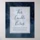 Ce panneau ciel céleste avec cadre cette bougie brûle est parfait pour votre mariage enchanteur sous les étoiles. Le ciel aquarelle bleu marine foncé, parsemé d'étoiles argentées, donnera le ton pour votre soirée de mariage bohème en plein air. Personnalisez-le comme vous le souhaitez ou gardez-le tel quel. N'oubliez pas de parcourir le reste de la collection pour compléter votre thème de mariage !
