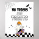 Célébrez un anniversaire cool et effrayant avec ce panneau Halloween de style rétro représentant un fantôme joueur faisant du skateboard et la phrase « Pas de farces, juste des friandises ». Parfait pour les fêtes d'anniversaire sur le thème d'Halloween pour garçons et les décors de photos.