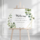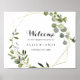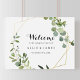 Ce panneau de bienvenue à la fête de fiançailles géométrique or vert est parfait pour une célébration de fiançailles simple. Le design présente de belles feuilles vertes peintes à la main, ornant un cadre géométrique doré.