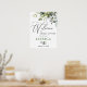 Accueillez vos invités à votre mariage avec l'Affiche de bienvenue pour une baby shower aux roses blanches et à la verdure florale, avec une verdure botanique luxuriante aquarelle et des fleurs blanches, avec "bienvenue dans notre bonheur éternel", vos noms et la date du mariage dans un mélange chic de typographies modernes et de calligraphie manuscrite.