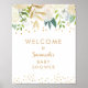 Panneau de bienvenue pour baby shower avec fleurs blanches, feuillage et une touche de confettis dorés. Voir la collection pour les articles coordonnés.