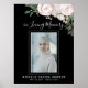 Ce panneau de bienvenue élégant et floral pour funérailles représentant une femme avec un bouquet luxuriant de roses roses et de fleurs rustiques, une photo de votre proche dans un cadre blanc, leur nom et dates de vie et le texte en souvenir affectueux sur un fond noir simple.