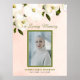 Cette belle pancarte funéraire florale élégante représentant une femme avec des fleurs blanches, une photo de votre proche dans un cadre vert, leur nom et dates de vie. Le fond de ce mémorial en souvenir vivant est rose pêche pâle.