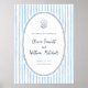 Un panneau de bienvenue fantaisiste pour aller avec notre collection de mariage Rayures Bleues Rétro Fantaisie. Ce design présente un cadre dessiné à la main bleu marine sur un fond rayé bleu clair et une illustration gribouillée d'un anneau de diamant dans une boîte à anneau de coquillage. Les détails suivent avec les noms des mariés dans un lettrage script charmant. Idéal pour les thèmes de mariage estivaux, italiens, de plage, de yacht et de côte. C'est une version d'affiche du design. Il existe une version en panneau de mousse disponible dans la collection. Consultez la collection liée sur cette page pour les articles assortis. N'hésitez pas à m'envoyer un message si vous avez des questions, je serai ravi de vous aider !