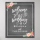 Bienvenue sur l'affiche de mariage avec fond tableau noir et roses peintes.