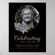 Panneau de bienvenue de photo de funérailles florales noir élégant avec une photo ornée de roses violettes et de baby's breath.