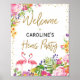 Magnifique panneau de bienvenue pour fête de poules tropicales avec une illustration aquarelle de maman et bébé flamant, fleurs vibrantes et lettrage en faux or. Ce poster de bienvenue est parfait pour une baby shower thème été / tropical / hawaïen / luau.