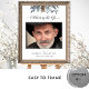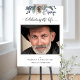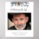 Mes condoléances pour votre perte. Honorez votre proche avec un élégant panneau de bienvenue de photo de funérailles délicat et attentionné avec un exquis design de feuillage peint à la main à l'aquarelle sur le dessus et la phrase "Célébrer la vie de" en calligraphie moderne et gracieuse. Choix de plusieurs tailles. Design de feuillage et d'arbre de pin en tons de bleu, bleu marine, sauge, gris et vert. Livre d'or, panneau pour livre d'or, invitation et programme de funérailles/célébration de vie disponibles en assortiment. Fait partie de notre collection de mariage et d'événements "Rustic Blue Mountains".