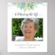 Mes condoléances pour votre perte. Honorez votre proche avec un élégant panneau de bienvenue photo de funérailles délicat et attentionné, orné d'un design de verdure aquarellé peint à la main et de la phrase "Célébrons la vie de" en calligraphie moderne et gracieuse. Choix de plusieurs tailles. Feuillage et taches aquarelles dans des teintes de turquoise pâle, de bleu et de vert. Faire-part de funérailles/célébration de vie, livre d'or, cartes de remerciement et programme coordonnés disponibles. Fait partie de notre collection "Funérailles délicates, Mémorial".