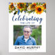 Panneau de bienvenue photo funéraire avec des tournesols aquarelles rustiques, des plumes et du feuillage, une photo de votre proche, son nom et ses dates.