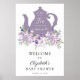 Accueillez vos invités à votre baby shower avec ce magnifique poster, mettant en vedette une théière lavande violette avec des fleurs violettes et roses et de la verdure. Ajoutez le nom de l'invitée d'honneur, la date de la fête et le texte de bienvenue personnalisé à l'aide des champs fournis.