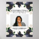 Un panneau de bienvenue pour des funérailles présentant des roses florales navy et blanches avec du feuillage vert et des accents de doré faux, une photographie de votre proche, son nom et ses dates.