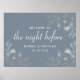 Définissez le ton de votre célébration de pré-mariage avec ce magnifique panneau de bienvenue pour dîner de répétition de couleur bleu poussiéreux élégant. Avec des accents floraux blancs délicats inspirés de l'ancien et une typographie classique mêlant serif et script, ce design intemporel accueille magnifiquement les invités à « la veille ». Personnalisez-le avec vos noms et la date pour un côté sophistiqué et romantique pour votre soirée. Un parfait accord avec une décoration de mariage bleue, grise ou florale.