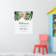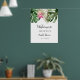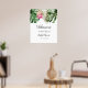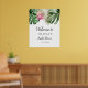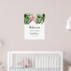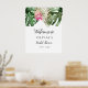 Panneau de bienvenue moderne pour une fête de mariage avec une illustration aquarelle de feuilles de monstera, de feuilles de palmier et de fleurs de protea roi rose. Parfait pour votre fête estivale.